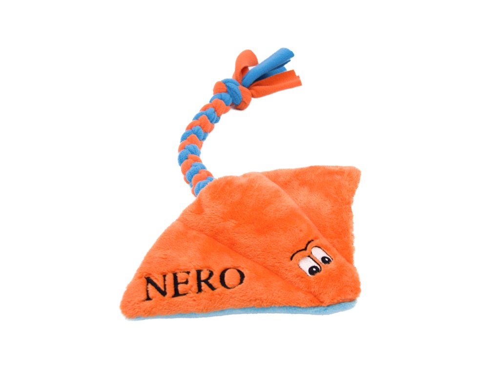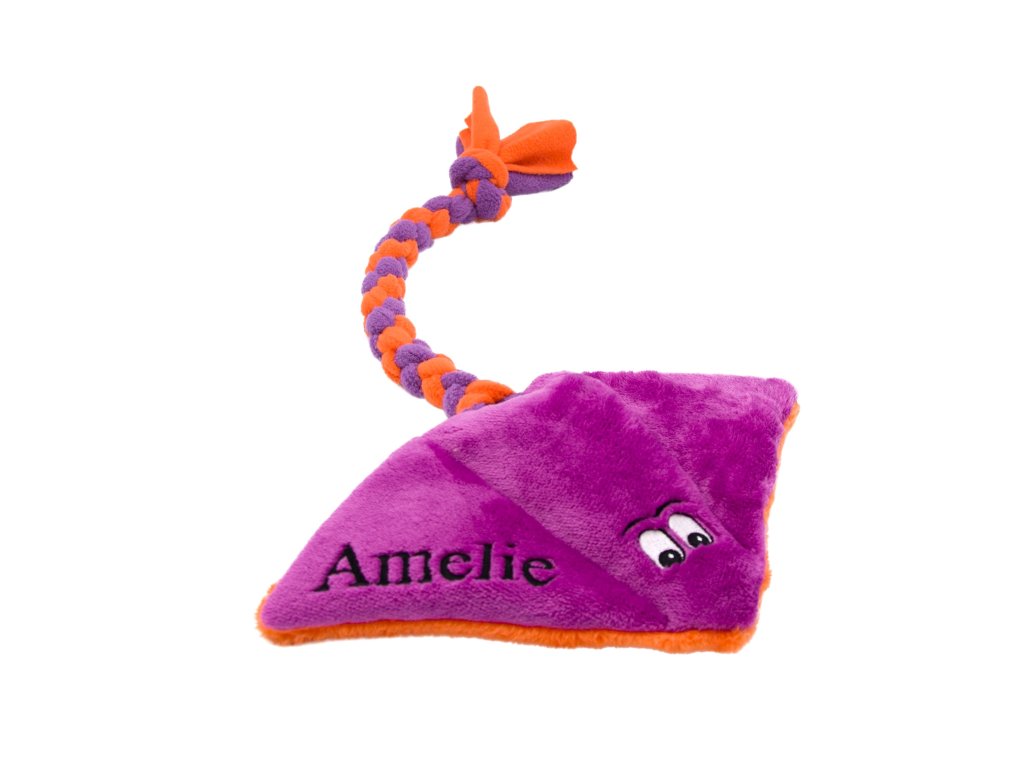 Velký rejnok pro psy se hodí pro všechny teriéry, kolie a jiné hlídače, kteří mají rádi přetahování. Na rejnoka vám rádi vyšijeme jméno vašeho pejska, takže si je na cvičáku nespletete. Uvnitř tělíčka má rejnok pískátko, které pejsky podněcuje ke hře. Rejnoka jsme vyrobili z prémiového plyše, který je na omak jemný a heboučký. Pro ušití jsme použili extra pevnou obuvnickou nit, proto odolá i divočejším hrám. Křídla rejnoka v sobě nemají žádnou výplň, díky tomu se dá hračka různě tvarovat, kroutit nebo muchlat. Rejnoka jsme ušili v naší dílně v Lounech.