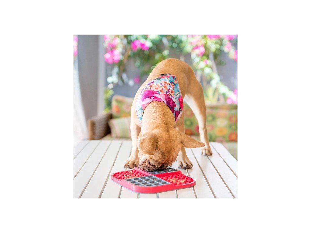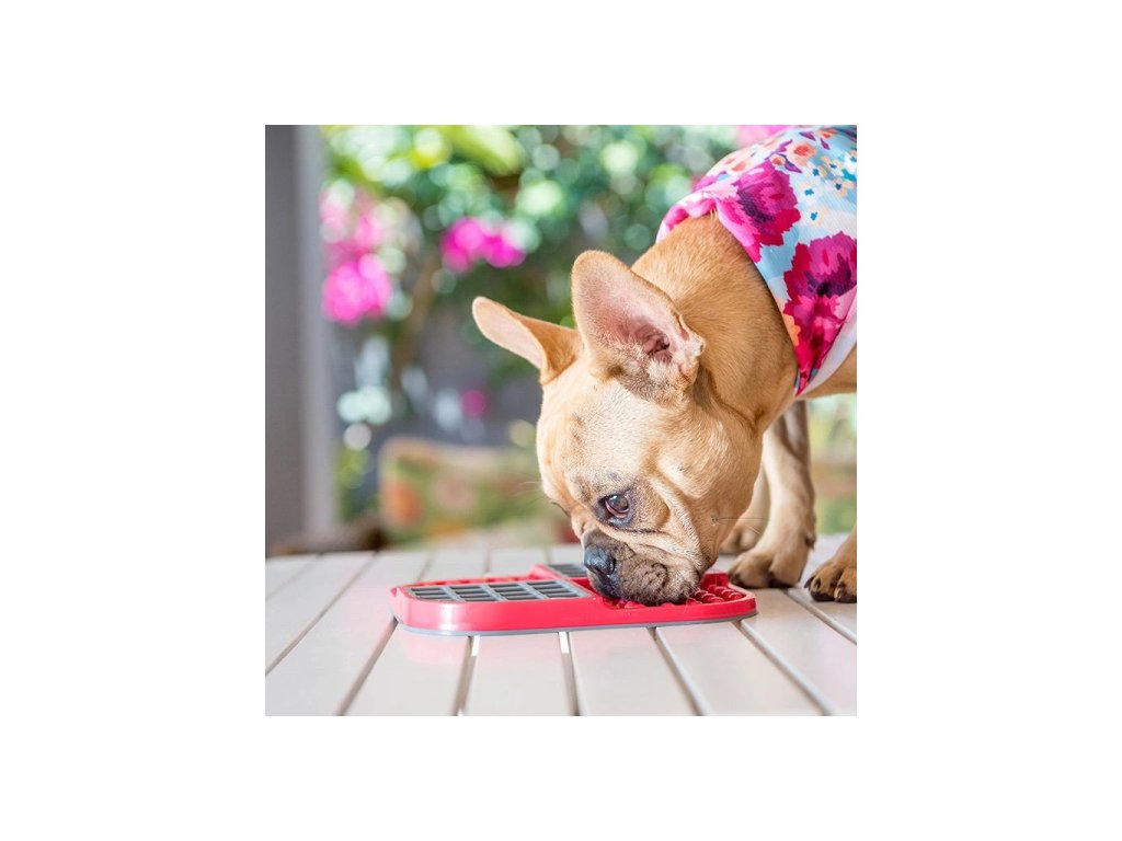LickiMat stimuluje jazyk vašeho psa a podporuje produkci slin, které přirozeně čistí jazyk, zuby i dásně. Tímto způsobem předcházíte zápachu z tlamy a zlepšujete celkové trávení. Podložka umožňuje rozložit menší množství krmiva na delší čas, což je ideální pro psy s tendencí k hltání a nadýmání. Díky tomu je podložka skvělým nástrojem i při redukčních dietách.