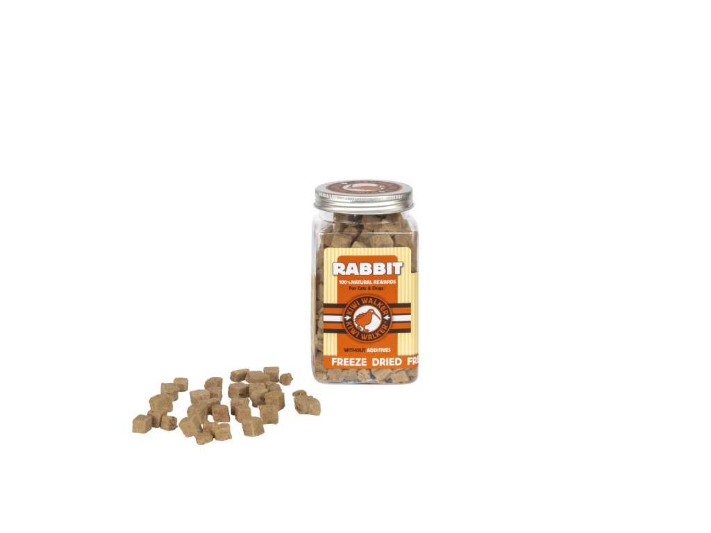Mrazem sušené králičí maso Kiwi Walker je prémiový přírodní pamlsek vyrobený ze 100% králičího masa, bez konzervantů, dochucovadel a jakýchkoli umělých přísad. Díky šetrnému procesu lyofilizace si maso uchovává svou přirozenou chuť, jemné aroma i výživové hodnoty, což z něj činí velmi atraktivní pochoutku pro psy i kočky.
