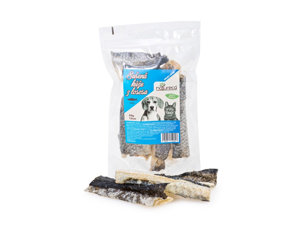Sušená kůže z lososa je 100 % přírodní krmná surovina z vedlejších produktů živočišného původu (9.1.1), určená jako pamlsek pro psy i kočky, bez konzervantů, dochucovadel a barviv. Díky výborné stravitelnosti je vhodná i pro zvířata s potravinovou alergií, navíc obsahuje omega-3 a omega-6 mastné kyseliny pro zdravou a lesklou srst.