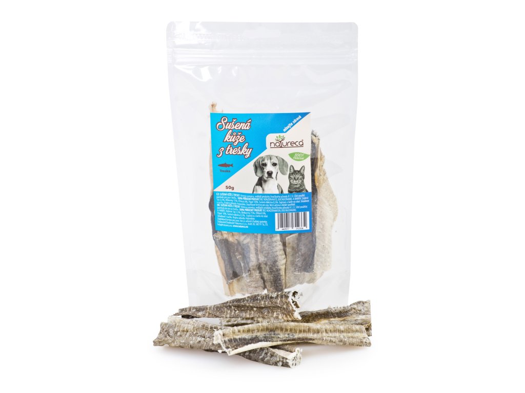 Treska poskytuje vysoký podíl bílkovin, důležité minerály a stopové prvky (draslík, fosfor, sodík), podporuje zdravé zažívání, posiluje žvýkací svaly a brání vzniku zubního povlaku. Pro malé psy a kočky doporučujeme kůži nastříhat na menší kousky. Při podávání vždy zajistěte čerstvou vodu.