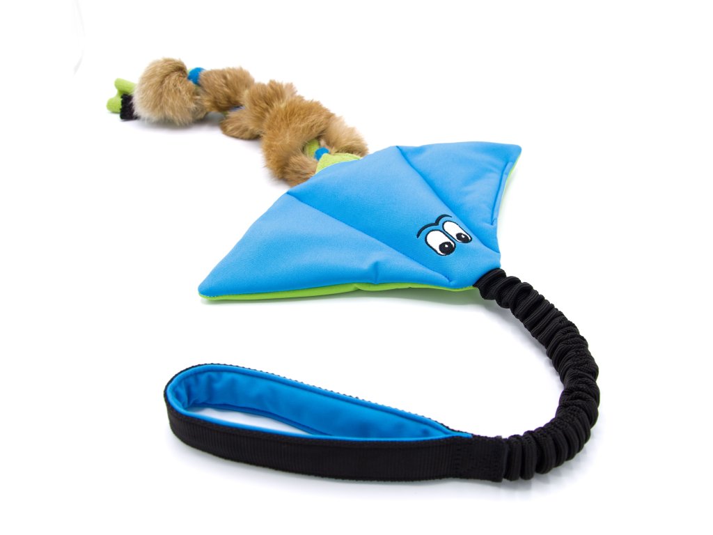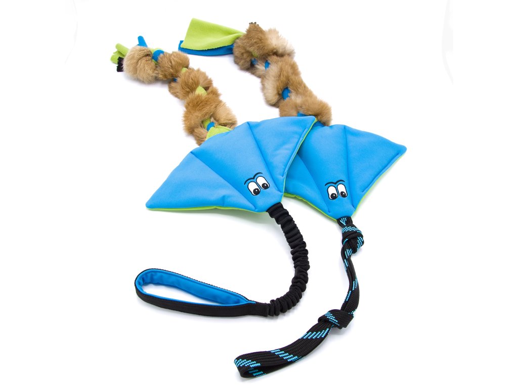 Rejnok ze softshellu s pravou králičí kožešinou a rukojetí, která může být buď klasická, nebo pružná (amortizér). Pravá kožešina psům velmi voní, díky tomu je ideální jako motivační hračka na tréninky psích sportů nebo na nácvik nových triků. Králičí kožešina je našitá k popruhu a pro větší pevnost je zamotaná s flísem. Do přetahování se tak nemusíte bát opřít vší silou. Rejnok má dvě pískátka, v každém křídle jedno a pohodlnou rukojeť, za kterou se dobře drží.