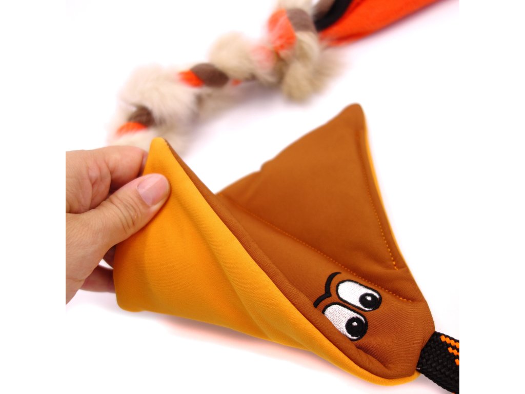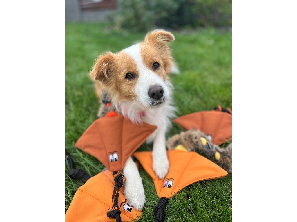 Rejnok má dvě pískátka, jedno v každém křídle, a pohodlnou rukojeť, za kterou se dobře drží i při intenzivním přetahování. Králičí kožešina je našitá k popruhu a zamotaná s flísem, takže se do hry můžete opřít vší silou, aniž byste se báli, že se hračka rozpadne jako špatný vtip.