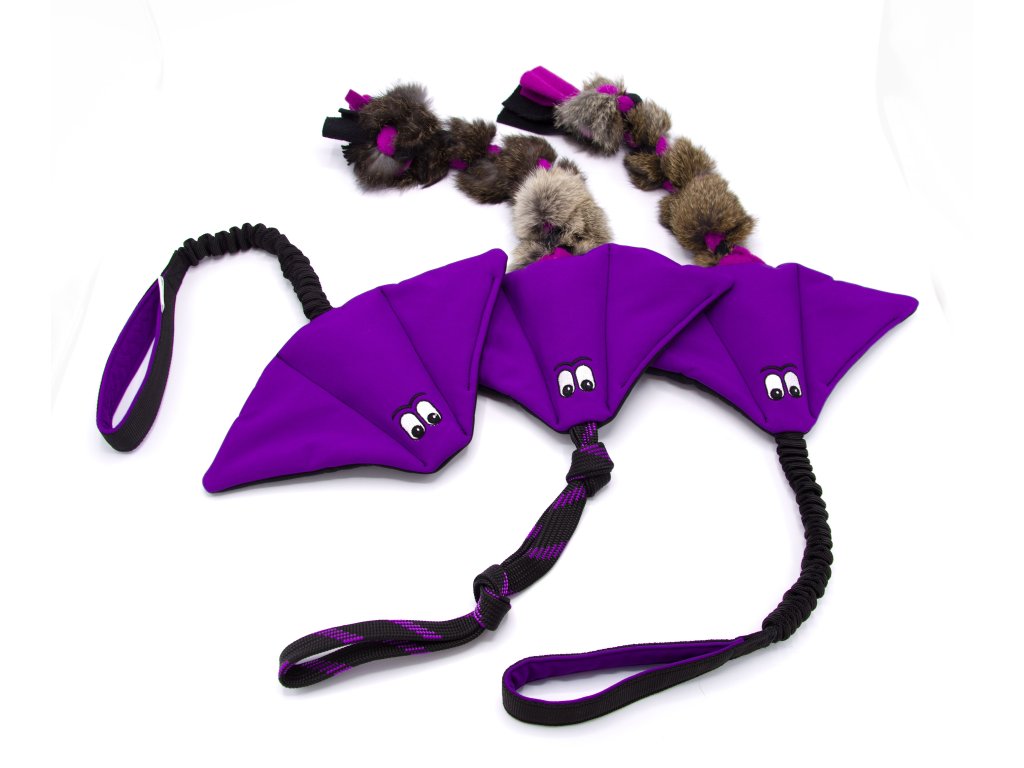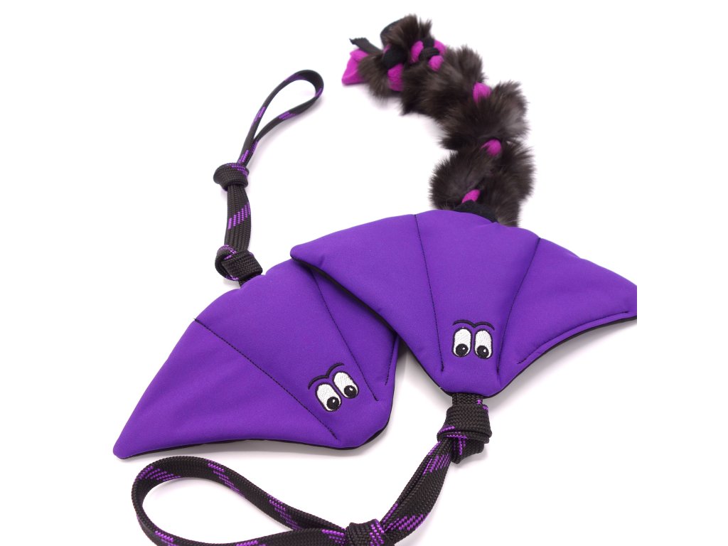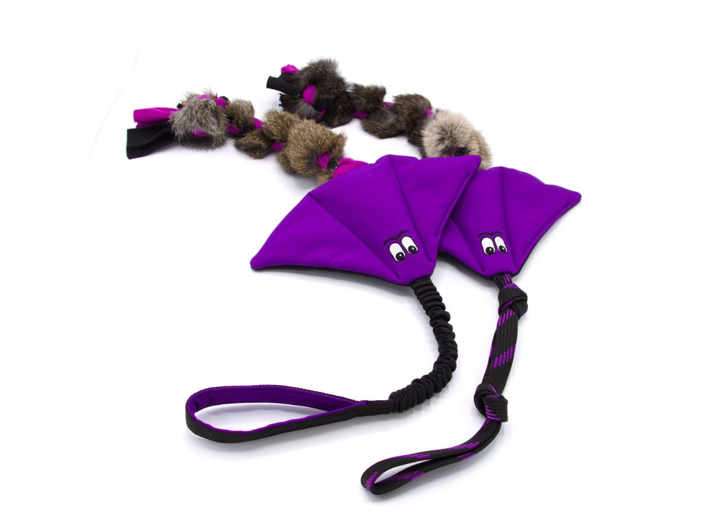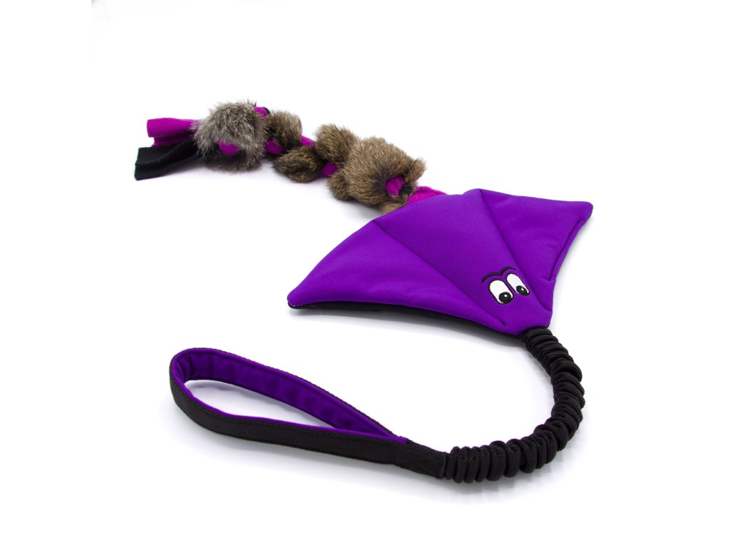 Rejnok ze softshellu s pravou králičí kožešinou a rukojetí, která může být buď klasická, nebo pružná (amortizér). Pravá kožešina psům velmi voní, díky tomu je ideální jako motivační hračka na tréninky psích sportů nebo na nácvik nových triků. Králičí kožešina je našitá k popruhu a pro větší pevnost je zamotaná s flísem. Do přetahování se tak nemusíte bát opřít vší silou. Rejnok má dvě pískátka, v každém křídle jedno a pohodlnou rukojeť, za kterou se dobře drží.