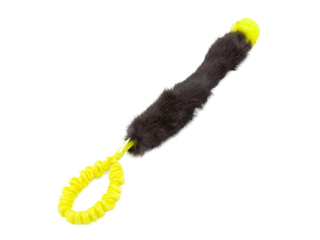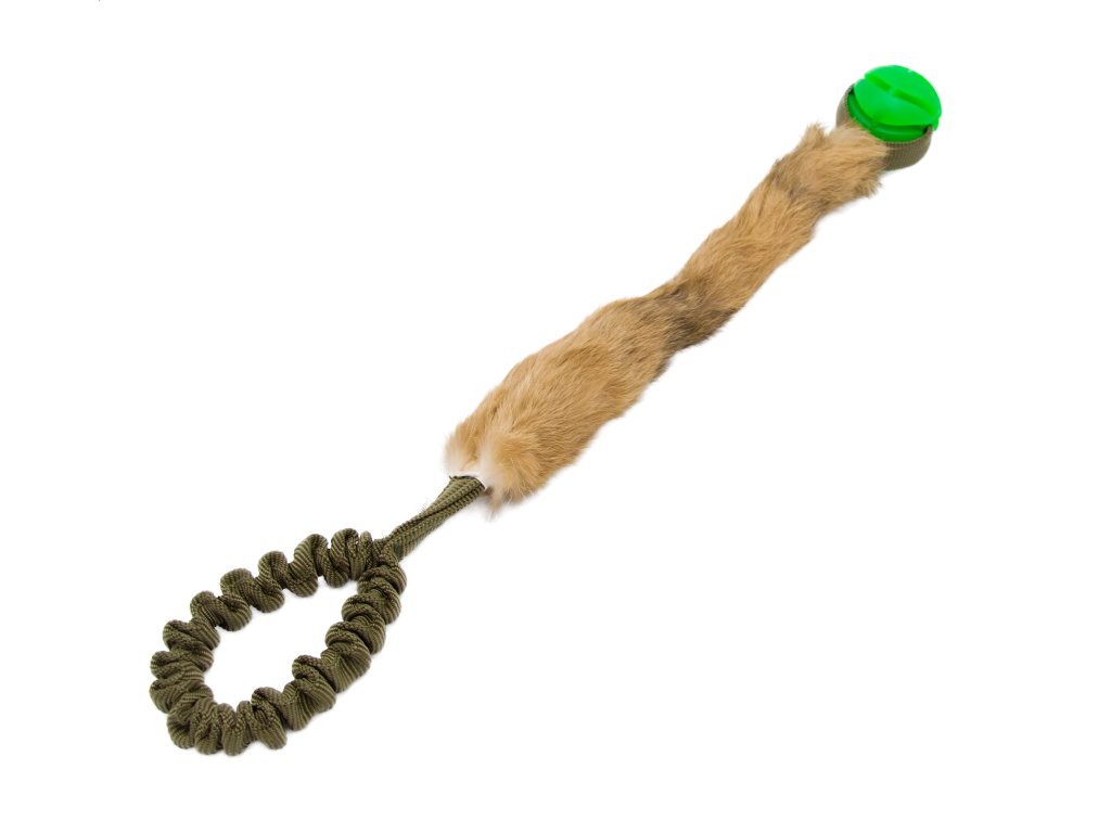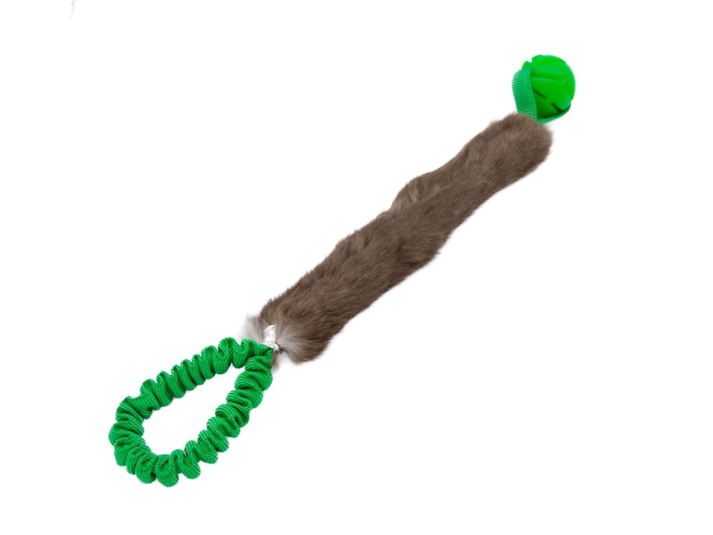 Králičí kožešina přitahuje pozornost psa svou vůní a měkkostí, zatímco míček o průměru 5 cm slouží jako zábavný a odolný prvek pro tahání a aportování. Přetahovadlo je vybaveno amortizérem, který zvyšuje pružnost a zpříjemňuje hru tím, že tlumí nárazy a umožňuje dynamické pohyby.