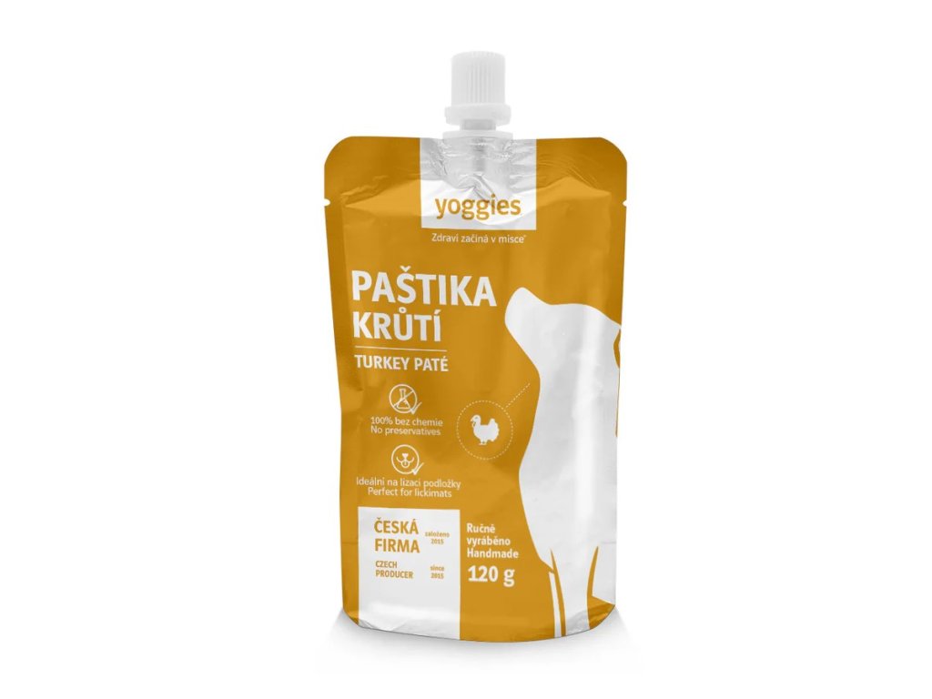 Yoggies paštika s příchutí krůtího masa má velmi jednoduché složení: čisté maso, vývar z masa a kostí a trochu tapioky jako přírodní zahušťovadlo. Neobsahuje žádné konzervanty, umělé přísady ani dochucovadla, což ji činí ideální i pro zvířata s citlivým zažíváním.