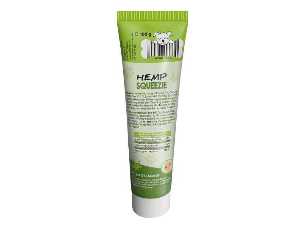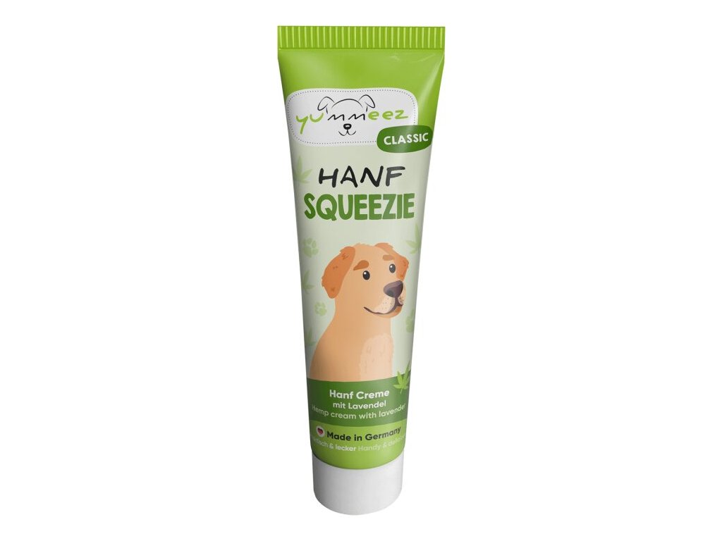 Yummeez Squeezie Hanf je lahodný pamlsek ve formě sladové pasty, obohacený o konopí a levanduli. Tento chutný a zdravý krémový pamlsek je ideální odměnou při tréninku, do plnících hraček i na lízací podložky.